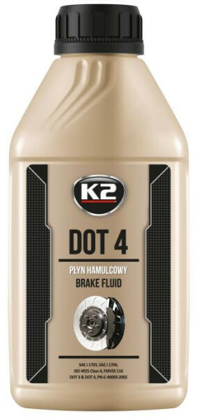 A K2 DOT 4 egy teljesen szintetikus, kiváló minőségű fékfolyadék, amelyet nagyon nagy terhelésű autók fék- és tengelykapcsoló rendszerében használnak. Professzionális autójavító műhelyek ajánlják. A DOT 4 fékfolyadék kiváló reológiai paraméterekkel rendelkezik, így nagyon alacsony hőmérsékleten is használható. Semleges a fékrendszerben használt tömítésekkel és fémötvözetekkel szemben, és védi a korróziótól. A fékfolyadék K2 DOT 4 forráspontja meghaladja a 230 C fokot, ennek köszönhetően hosszabb ideig megőrzi tulajdonságait. A termék teljesen elegyedik más DOT osztályú folyadékokkal A K2 DOT 4 ABS, ESP, ASR, SBC rendszerű autókhoz készült. Megfelel a hatályos PN-C-40005:2002 szabvány követelményeinek, valamint az FMVSS 116 DOT4, SAE J 1703, SAEJ 1704, ISO4925, Class 4, FMVSS 116 amerikai szabványoknak.